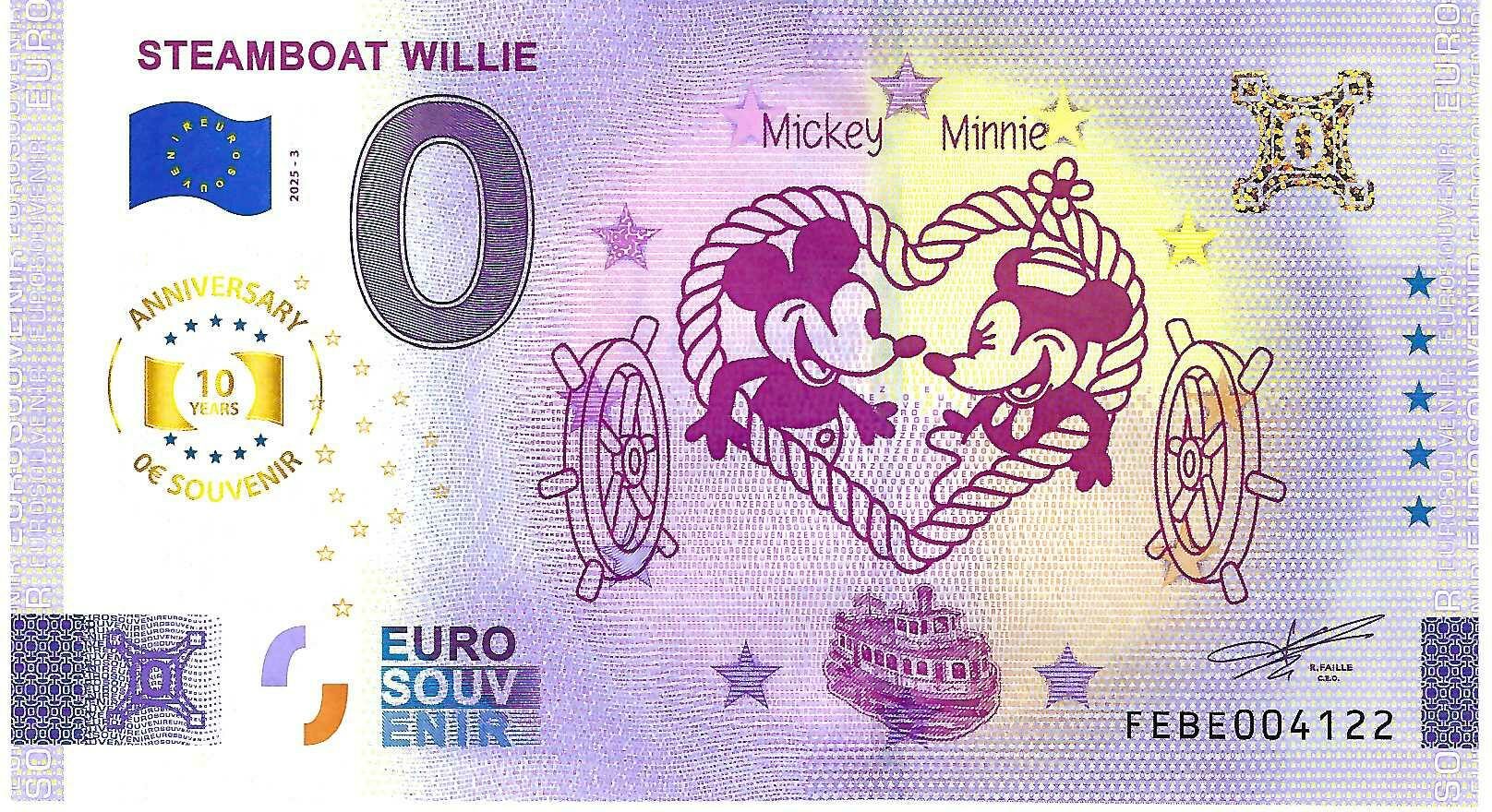 0 Euro biljet Malta 2025 - Steamboat Willie ANNIVERSARY